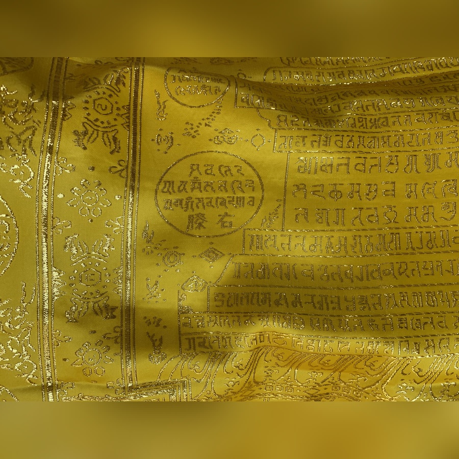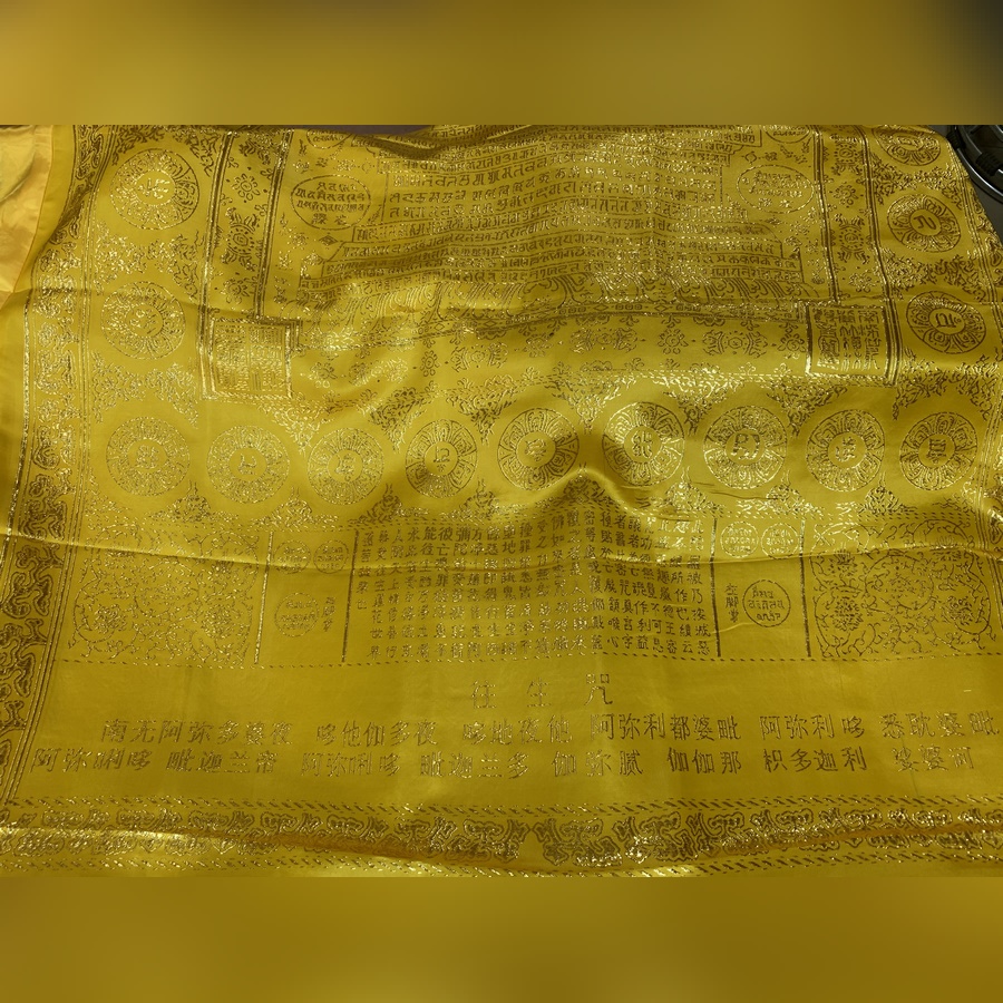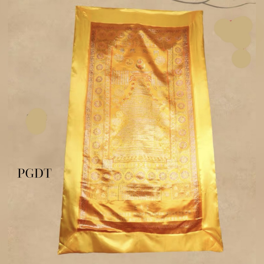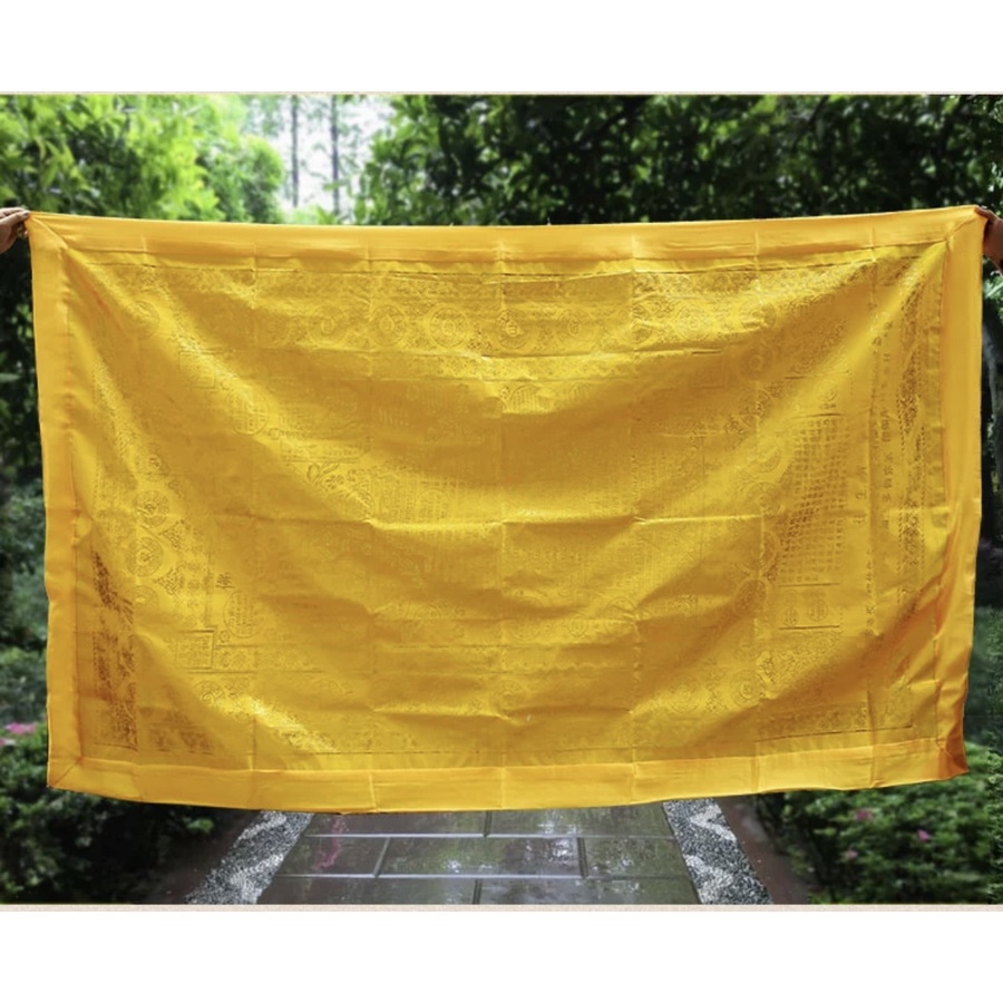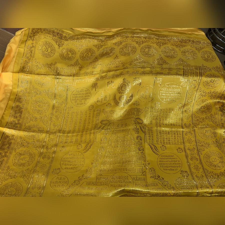 - kt: 2.3mx1.3m, vải lụa bóng mềm mại dệt nổi chữ Kinh văn bằng chữ Phạn và chữ Hoa. Viền may tỉ mỉ