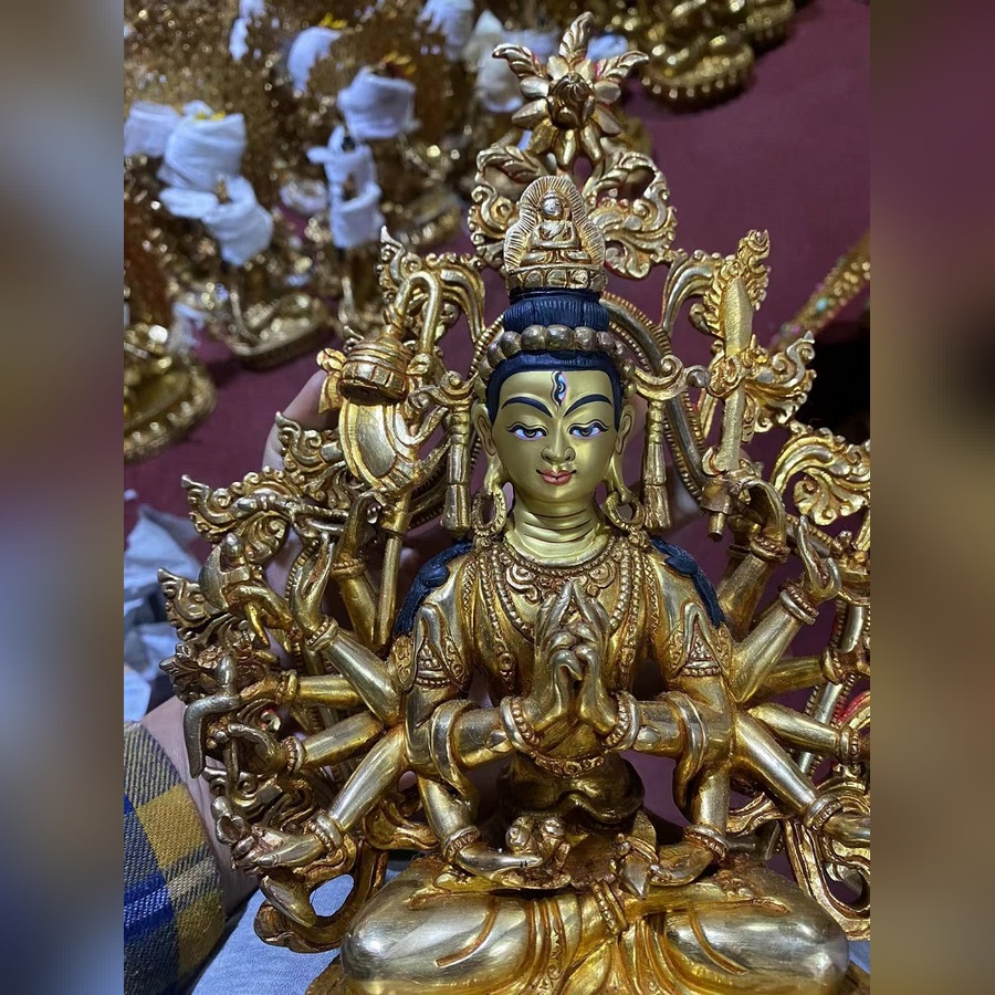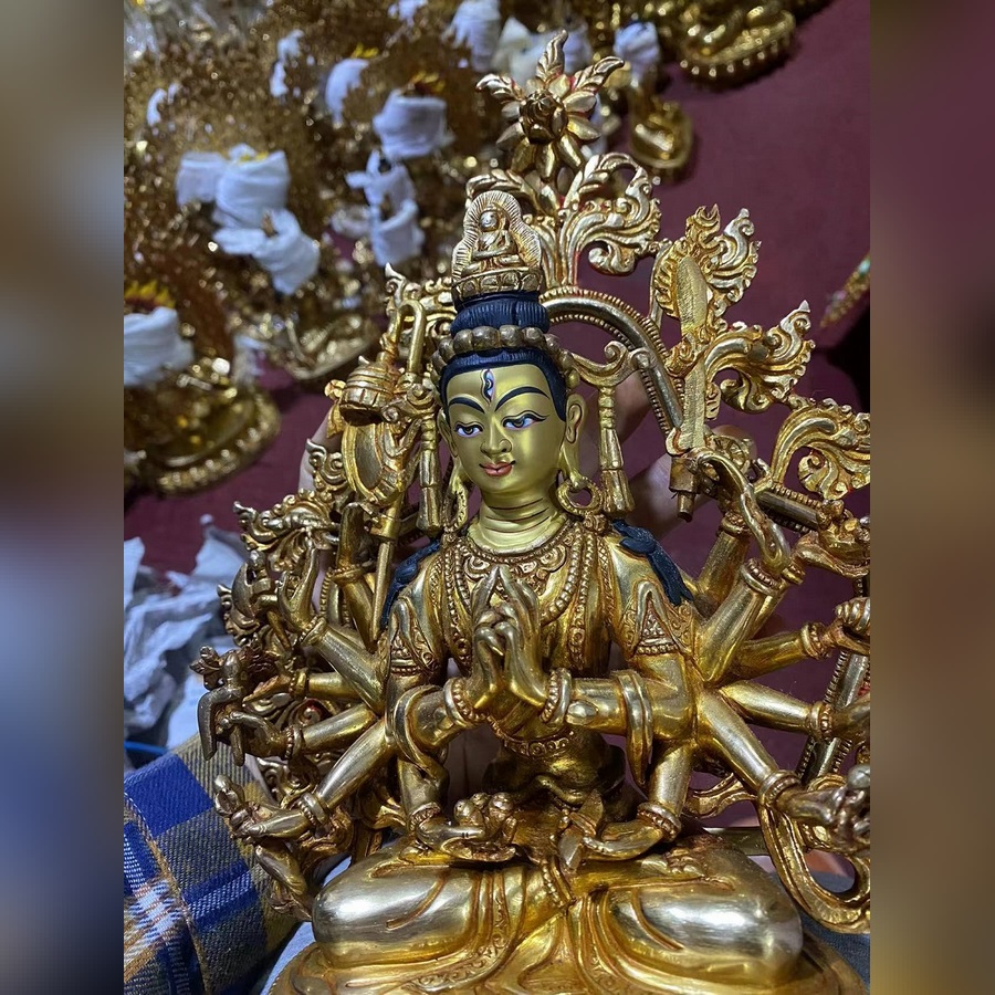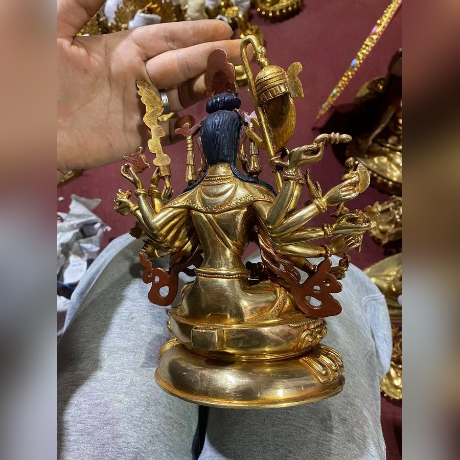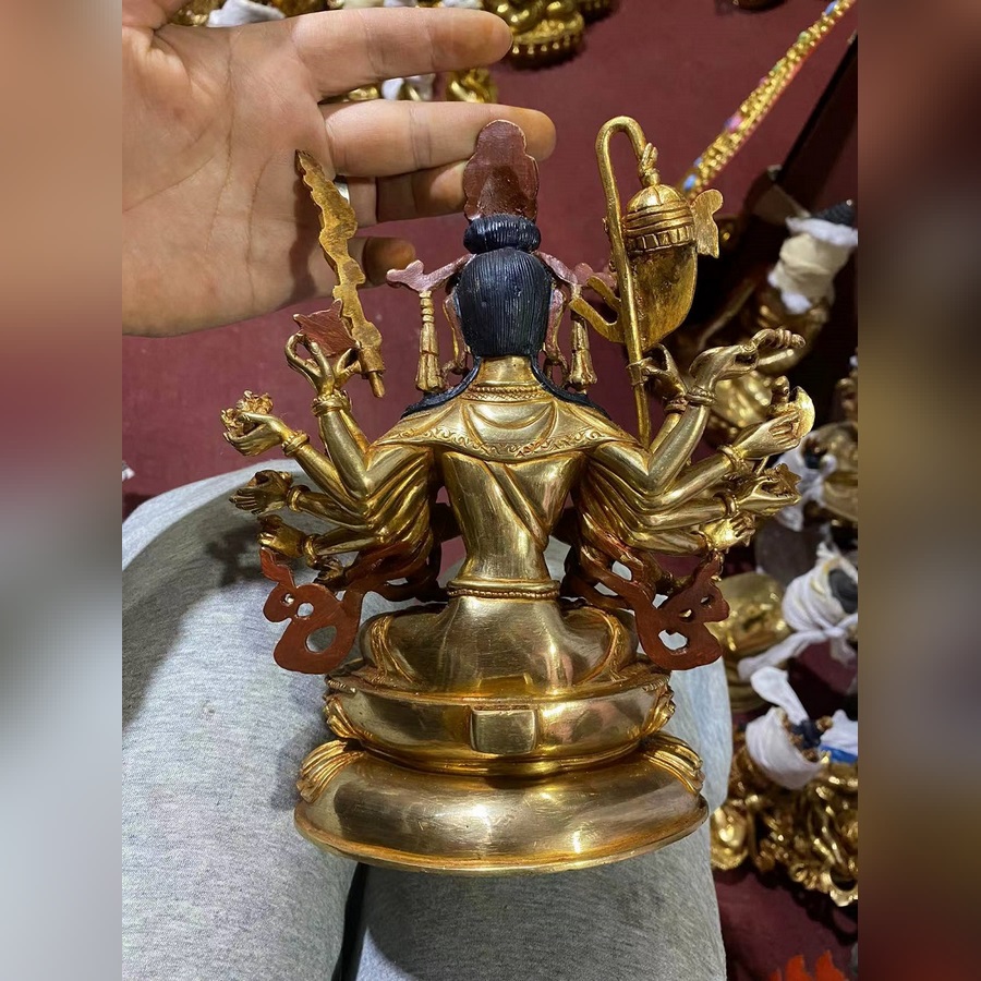 Tay trái thứ tám cầm một bình như ý, còn tay mặt cầm một cái chày kim cang.
