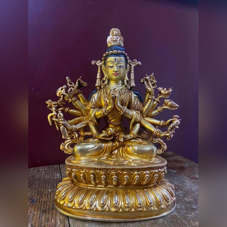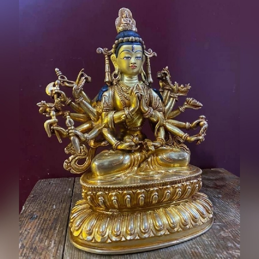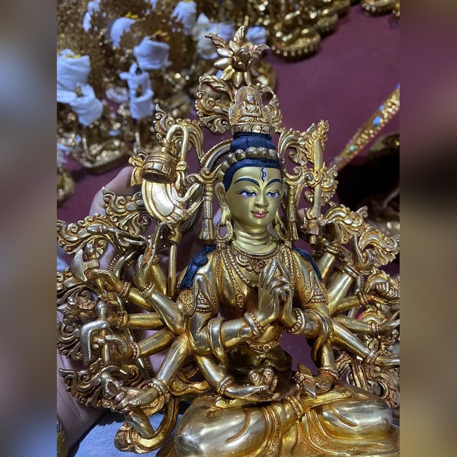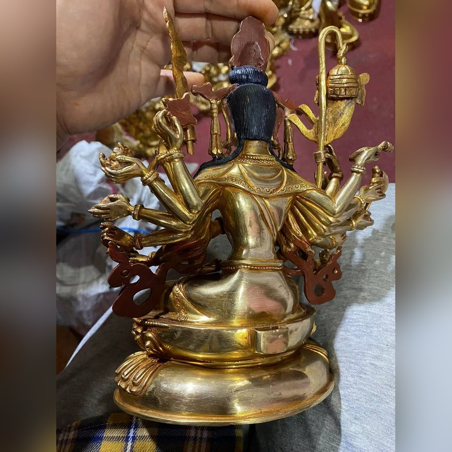 Tay trái thứ tám cầm một bình như ý, còn tay mặt cầm một cái chày kim cang.