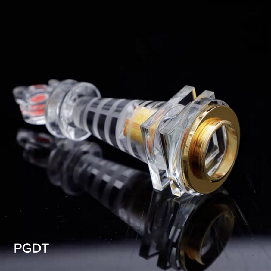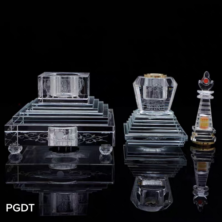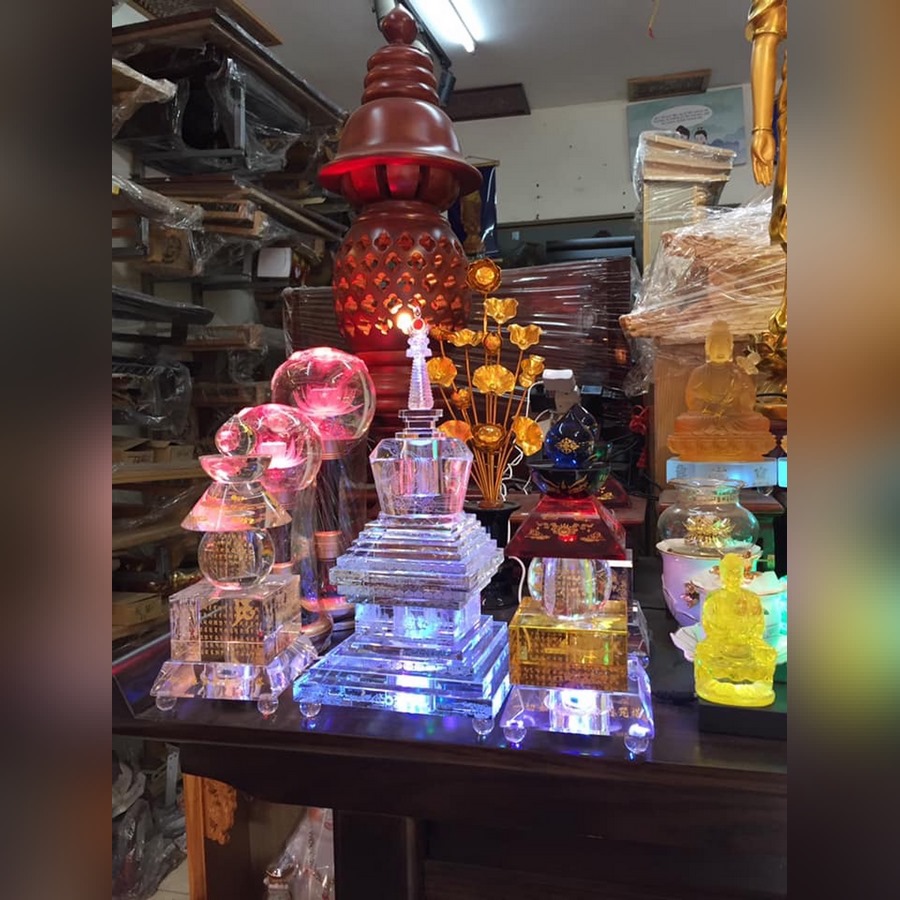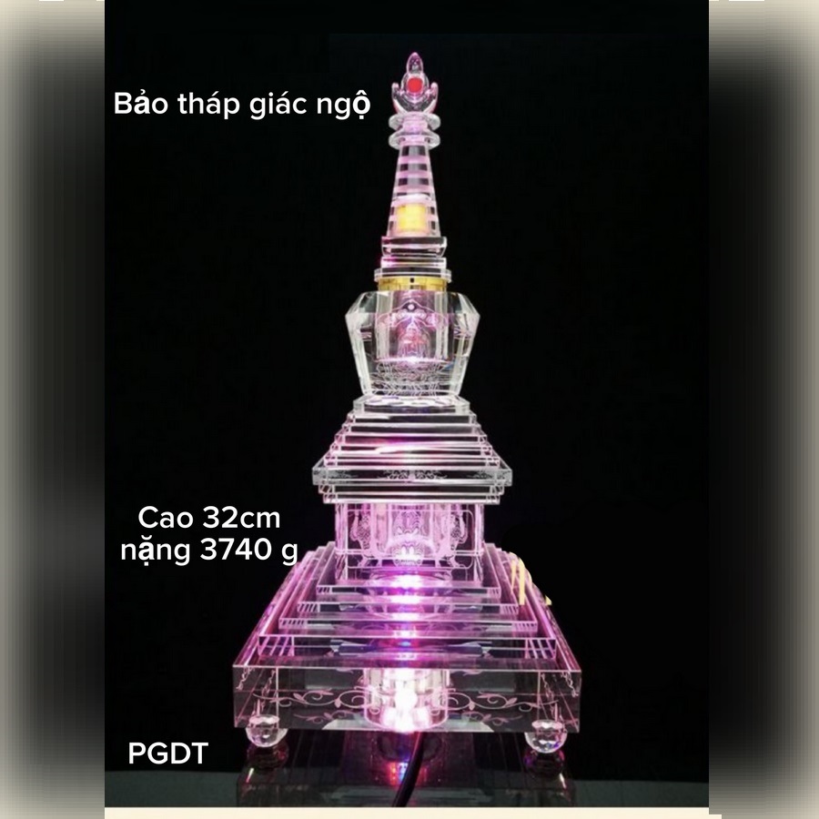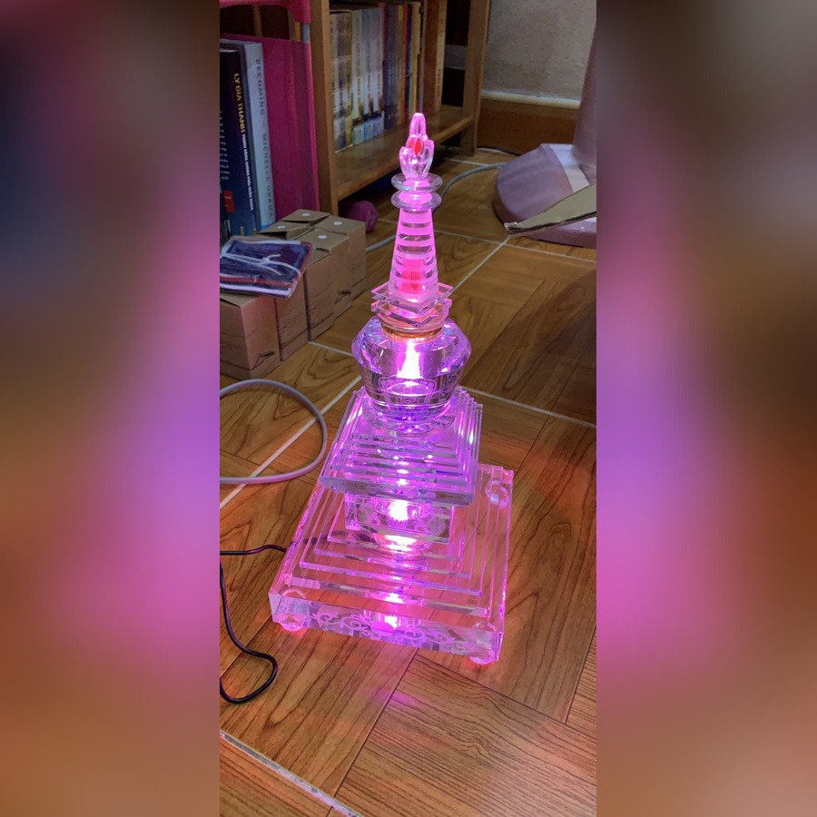 ⁃ bằng pha lê, cao khoảng 32cm , phát sáng đèn led 7 màu rất đẹp, chất lượng cao