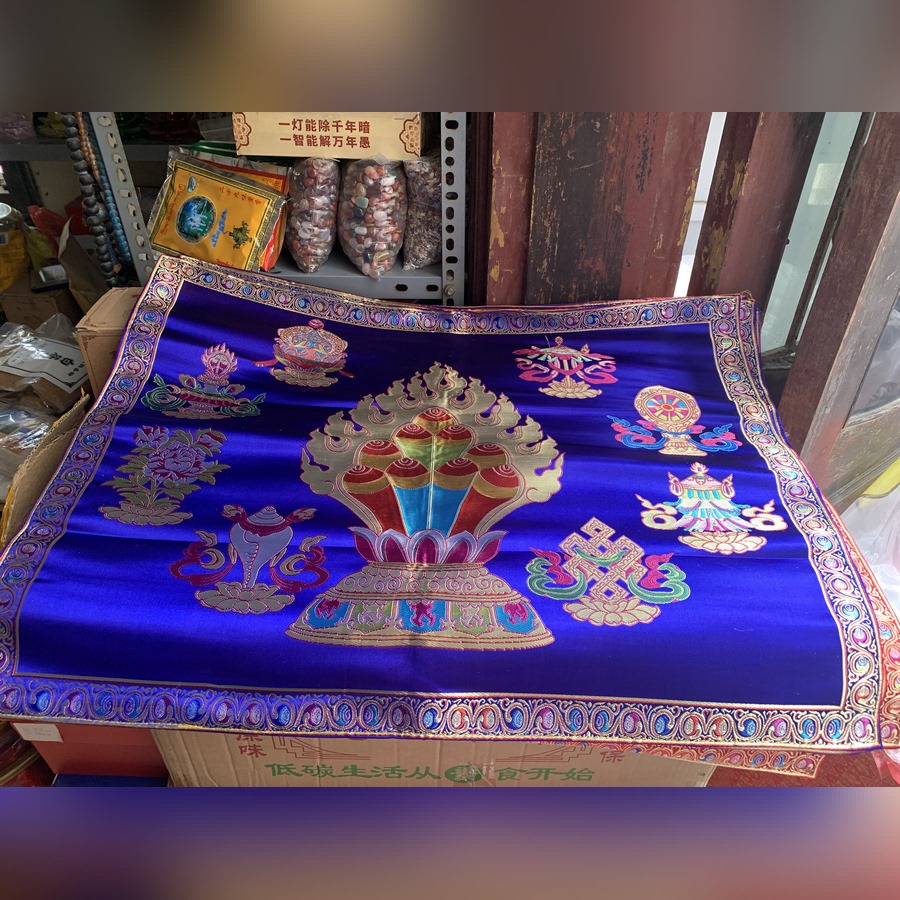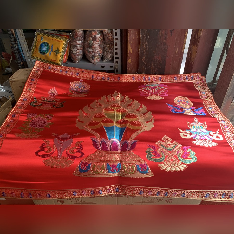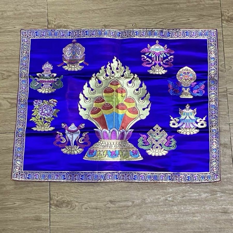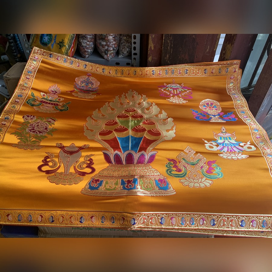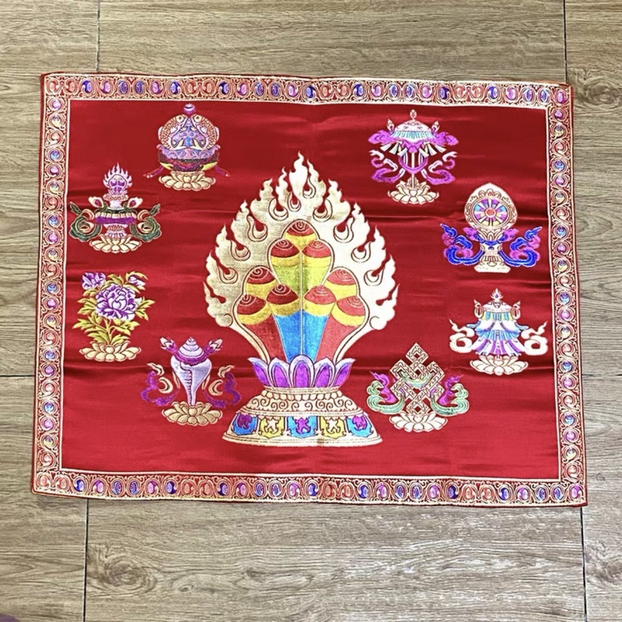 Khăn gấm thêu biểu tượng Ngọc Mani và Bát Đại Cát Tường