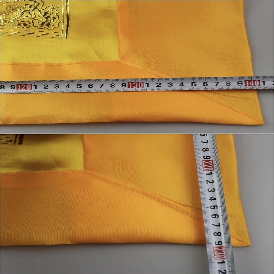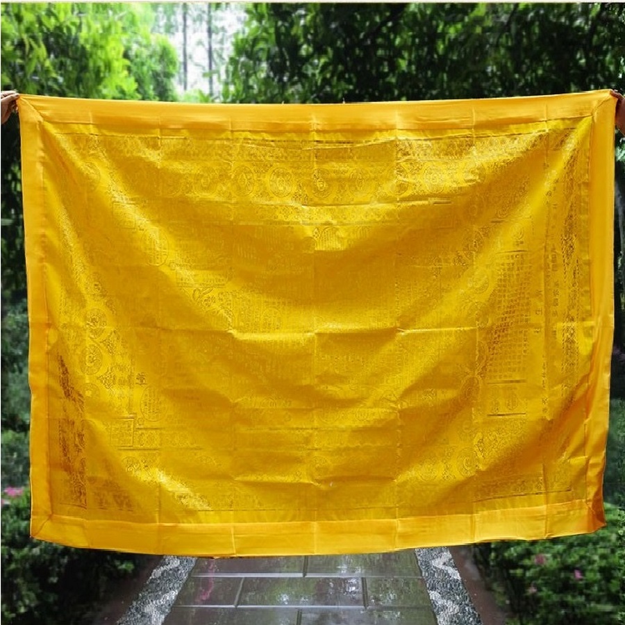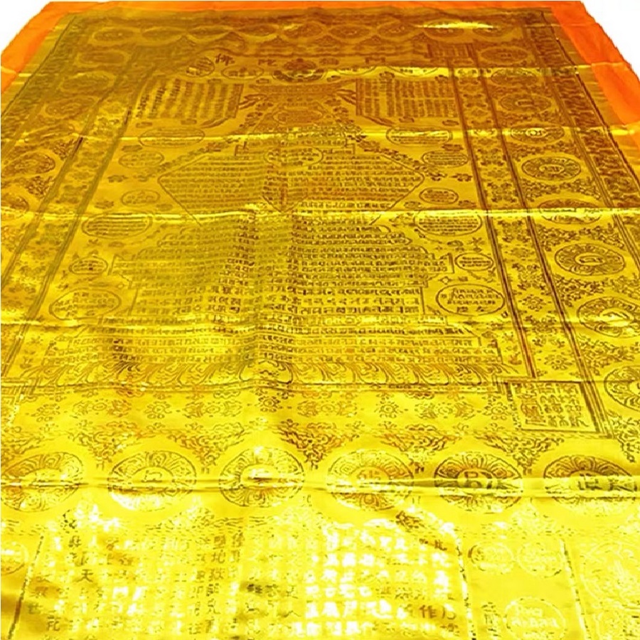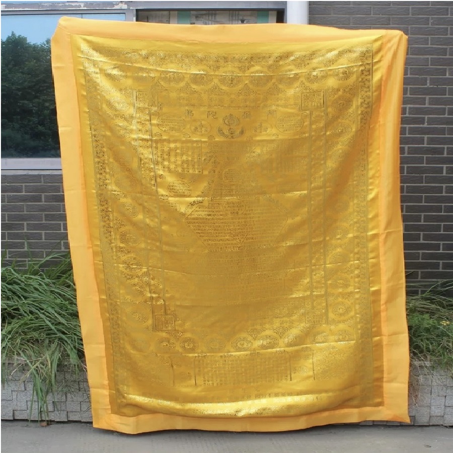 - kt: khoảng 225 x 140 cm , vải lụa bóng mềm mại thêu nổi chữ Kinh văn bằng chữ Phạn và chữ Hoa.