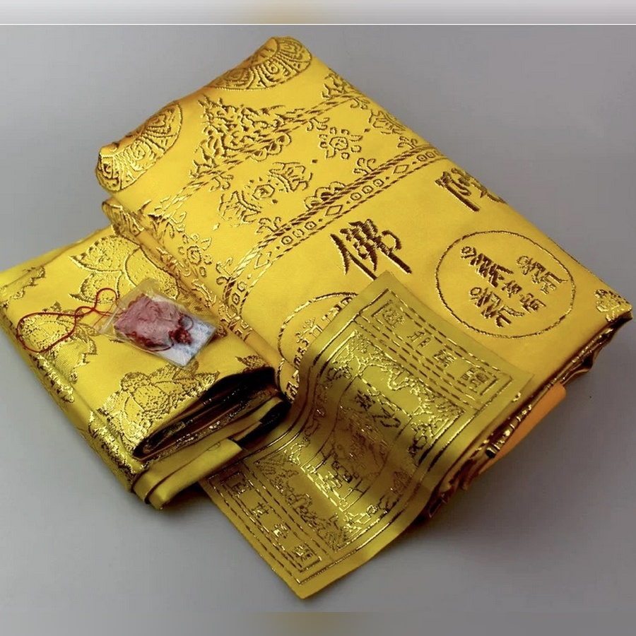 - chất lượng cao cấp. May 2 lớp tỉ mỉ. 1 bộ gồm: 1 mền chính và 1 khăn trải gối, 1 khăn che mặt , linh phù để lên ngực, 1 lọ cát quang minh tặng kèm.