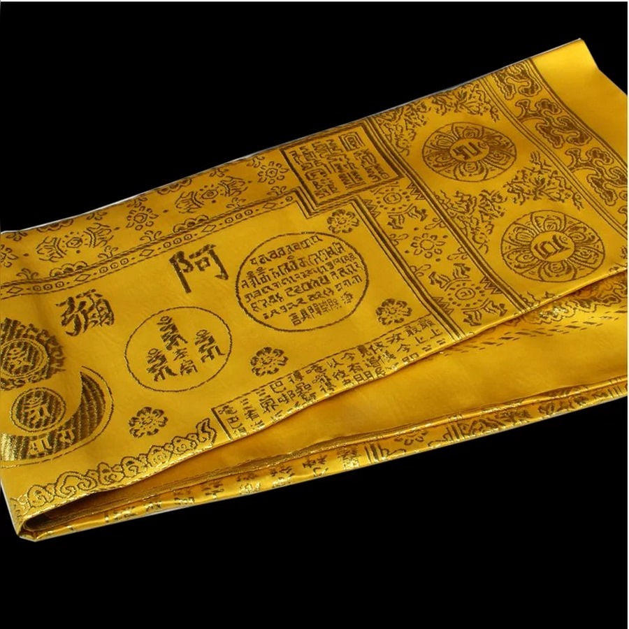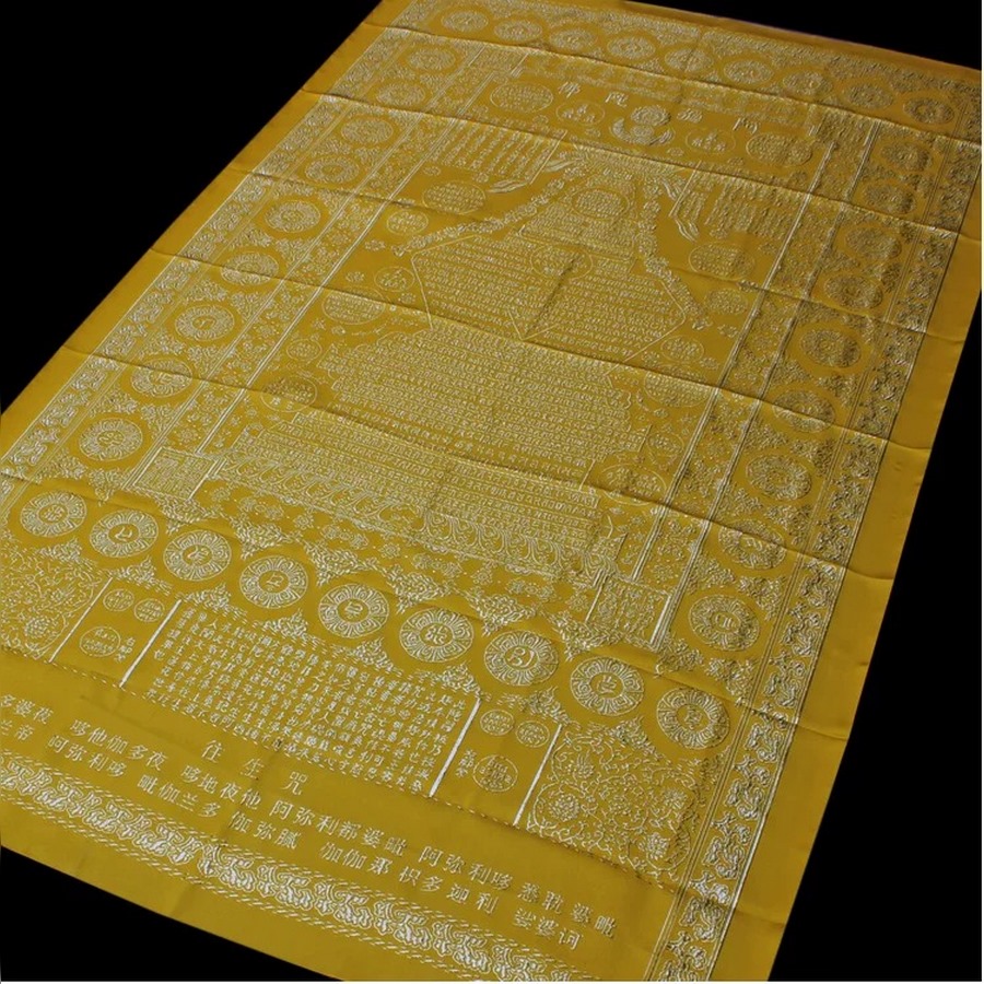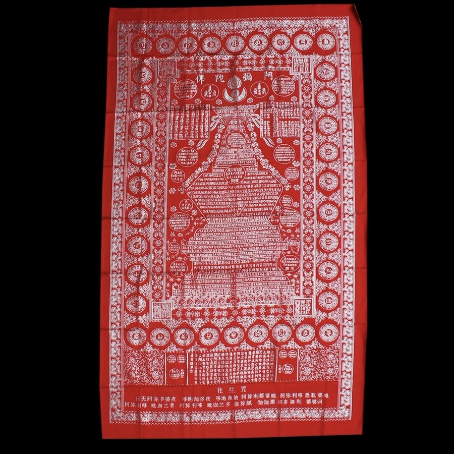 - kt: khoảng 200cm x 120cm , vải lụa bóng mềm mại thêu nổi chữ Kinh văn bằng chữ Phạn và chữ Hoa.