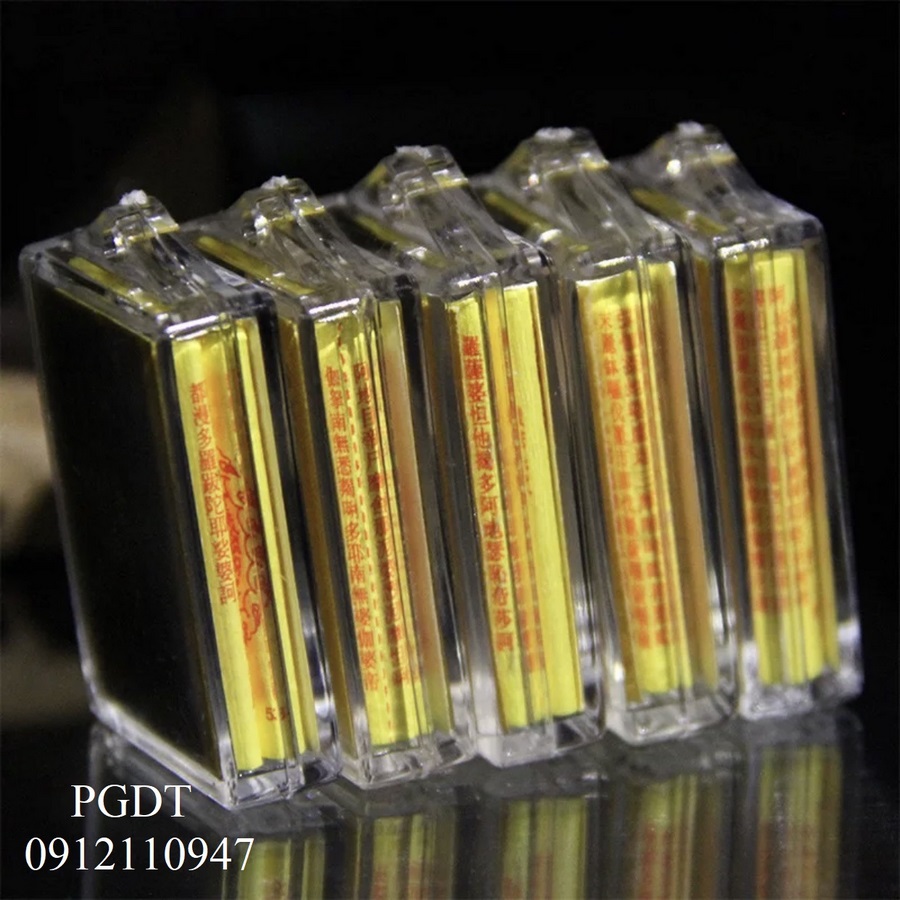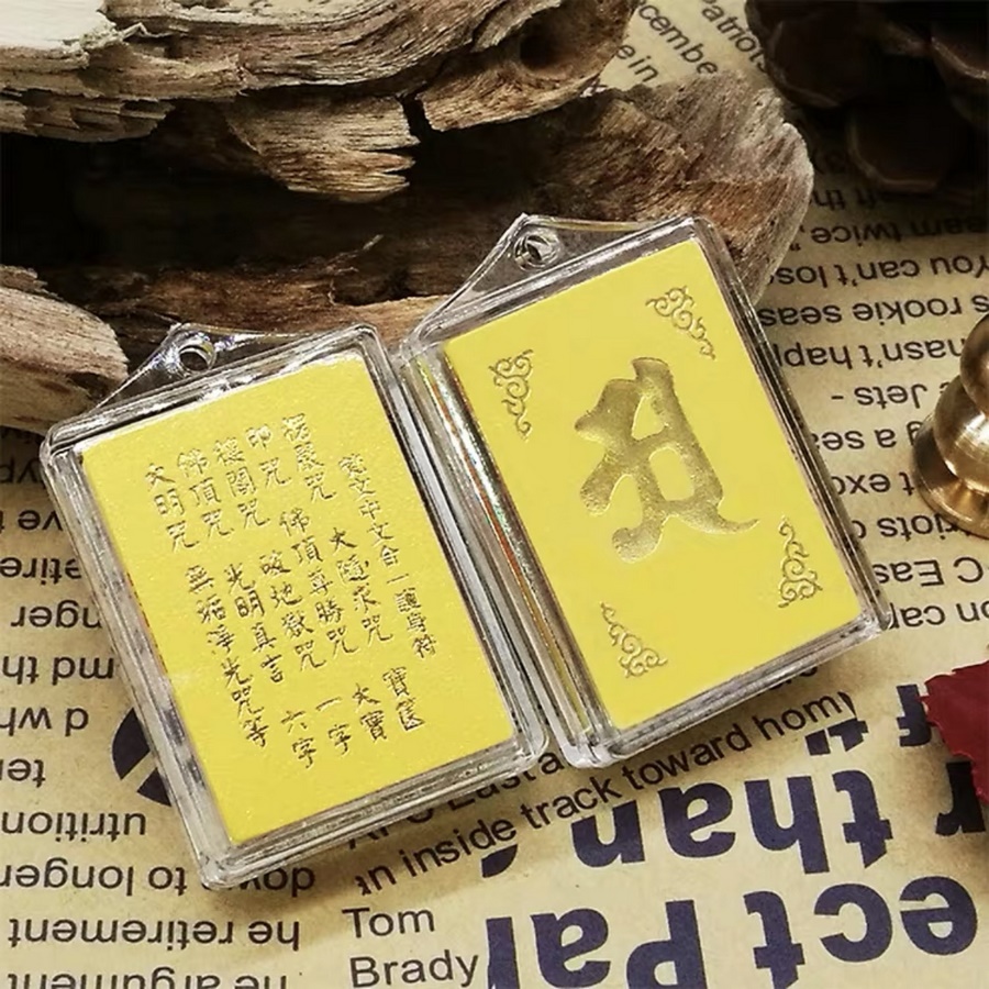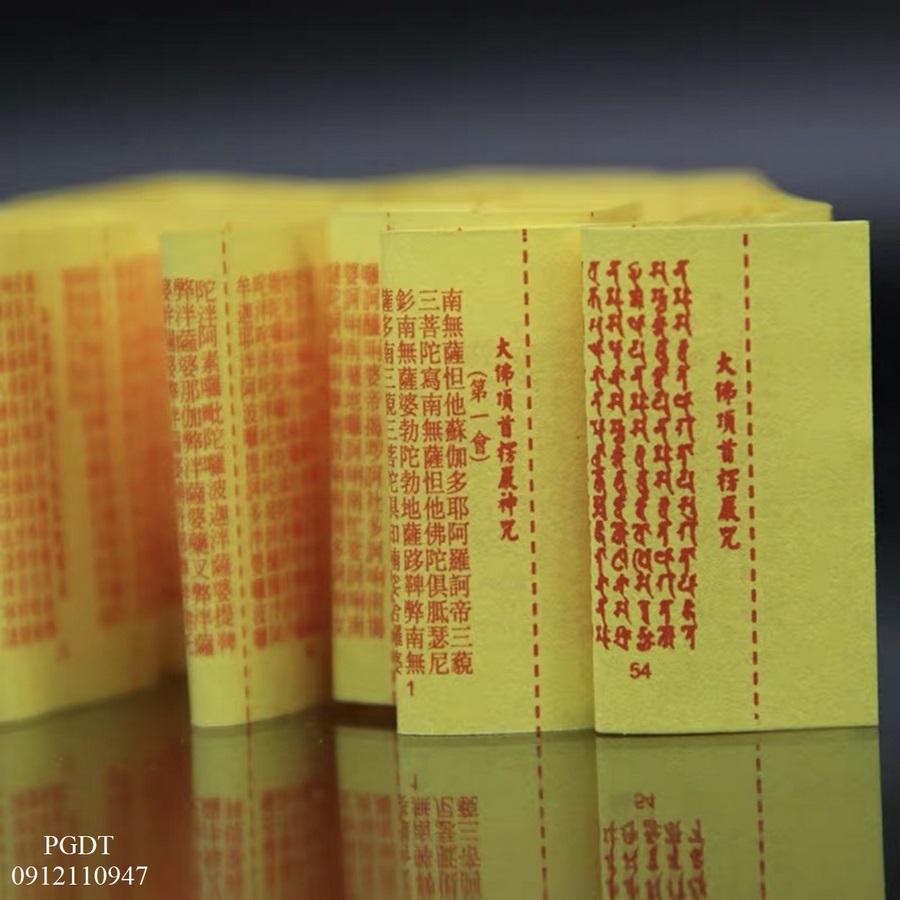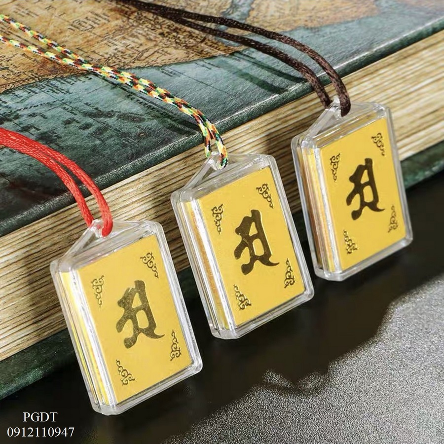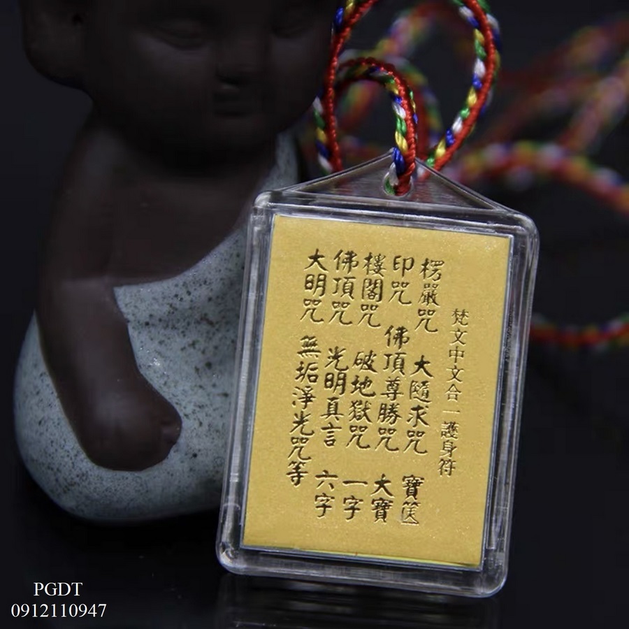 - Mặt dây chuyền được bọc nhựa bên trong là giấy được in nhiều chú bao gồm chú Lăng Nghiêm tiếng phạn. Theo nhàQuà tặng , chiêm bái phát hành, sản phẩm gồm 15 chú được in bằng tiếng phạn và 38 bánh xe chú khác.