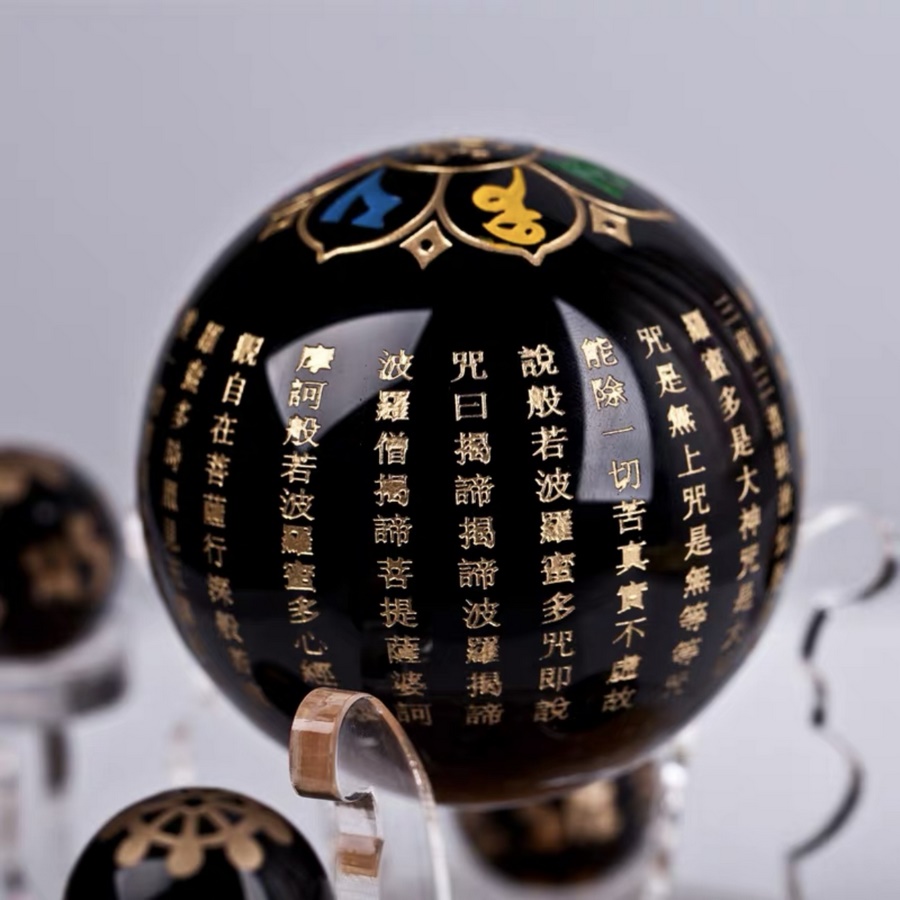 Đặt quả cầu bằng đá osidian - thạch anh núi lửa khắc Lục Tự Đại Minh Chân Ngôn và Bát Nhã Tâm Kinh trên bàn làm việc hoặc phòng khách, ... sẽ mang lại một số tác dụng sau :