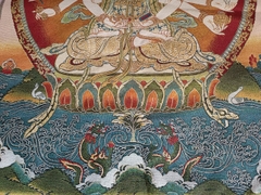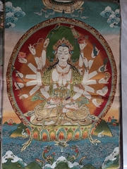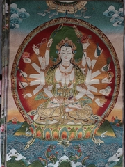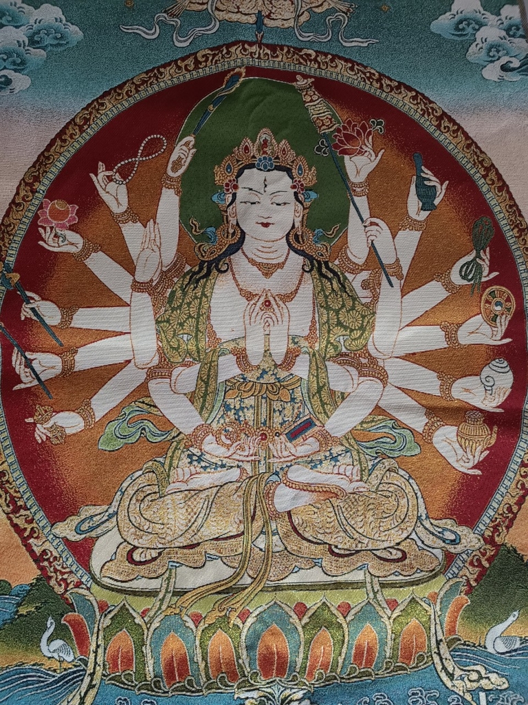 Trên người vị Thần này có 18 cánh tay cầm những pháp khí khác nhau. Ở những cánh tay phía bên phải cầm chày, móc, câu, búa…là những khí vật hung dữ để hàng phục chúng sinh hướng theo Phật pháp. Ngược lại, bên trái là những cánh tay cầm hoa sen, dải lụa, hộp kinh… Đây là những vật mà sau khi chúng sinh đã hướng theo Phật pháp thì được ban tặng